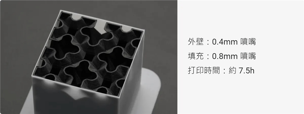 同時(shí),有68齒數(shù),12mm 直徑的雙擠出輪能夠與它們擠出的耗材充分接觸,從而向耗材施加穩(wěn)定的力,避免耗材因受力不均勻而過(guò)度擠出,或擠出不足。所以回到前面的問(wèn)題,答案是充分、穩(wěn)定的擠出,20mm³/s 的擠出流量以及高質(zhì)量的列印成果。