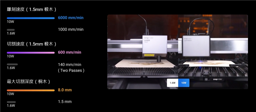 10W雷射模組單次切割厚度可達8mm,雕刻速度可達 6,000mm/min。相較於1.6W雷射模組,其切割速度可達 8 倍。從這個角度來看,切割速度是1.6W 激光模塊的8倍!
