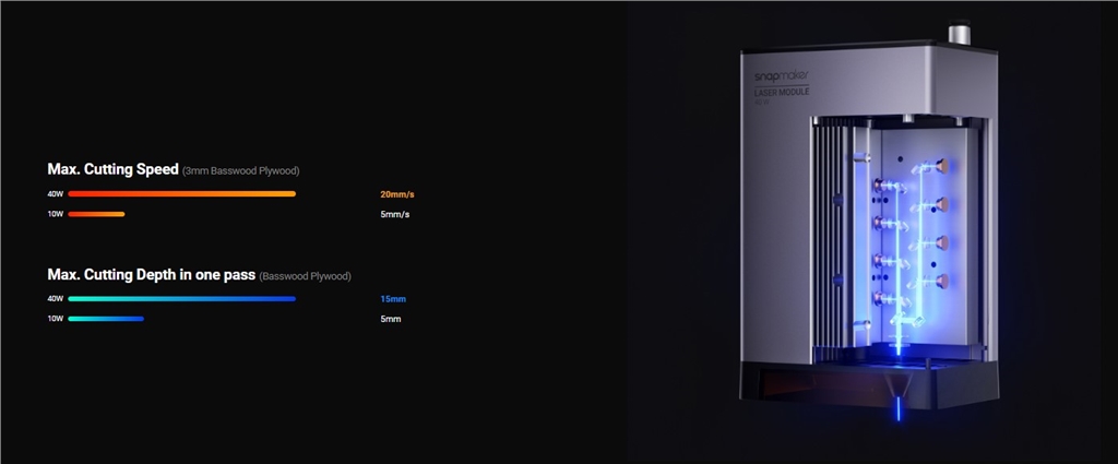 40W 雷射模組採用最先進的雷射分束器和光束整形光學(xué)元件,性能卓越。在切割 3 毫米椴木合板時,40W 雷射模組的速度是 10W 的 4 倍!