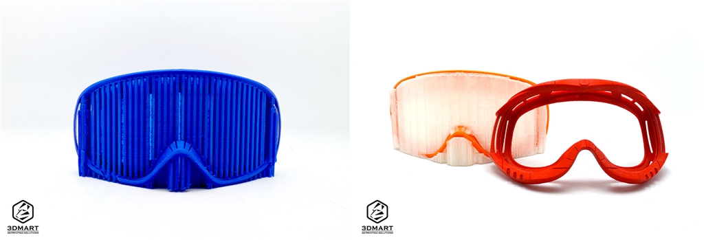 好處是這對(duì)於大面積的結(jié)構(gòu)影響不大、拆除也算方便,例如圖中的滑雪鏡框就可以用單噴頭系統(tǒng)製作懸空部分,不過表面的光滑度及美觀性會(huì)不如雙噴頭3D列印系統(tǒng)的表現(xiàn)。