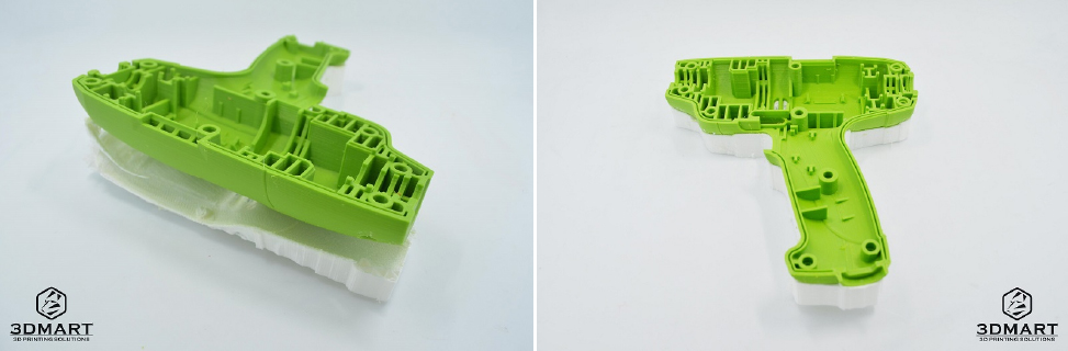 而另一款Breakaway支撐拆解性佳且速度快,但較適合大面積拆除的物體,例如下圖中的電鑽外殼因表面有美觀性的需求,因此下方僅需使用Breakaway支撐材料輔助列印,就可以達(dá)到整塊快速拆除的效果。