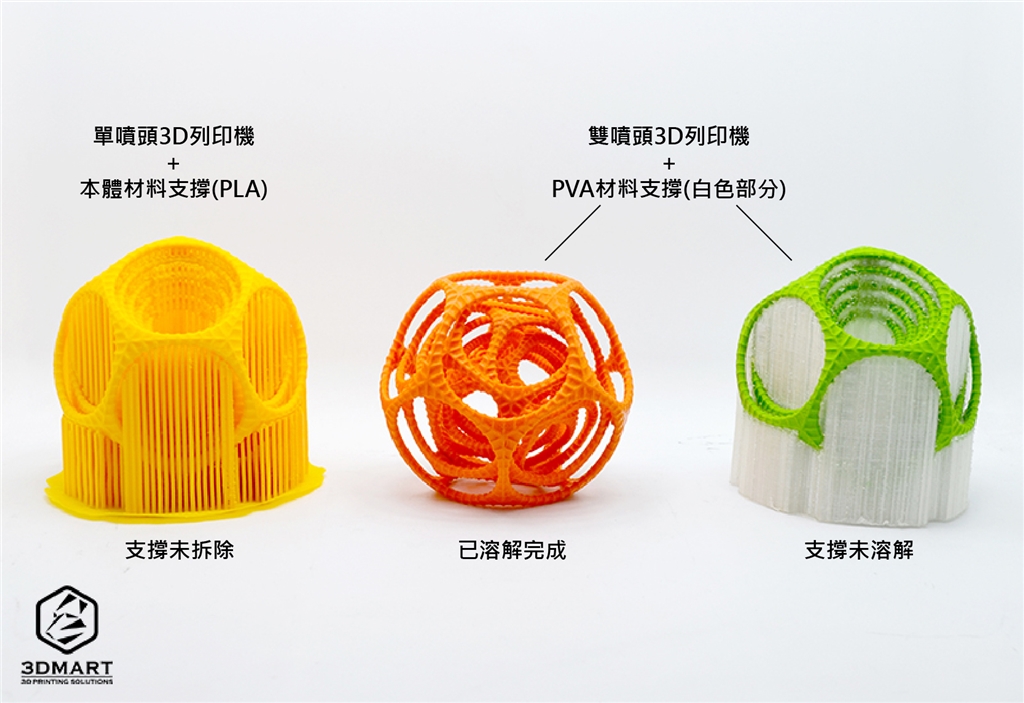 白色部分為PVA,是可生物分解的水溶性材料,搭配PLA結(jié)構(gòu)本體列印後,連同本體浸入一般冷水中即可溶解(如果配置打氣筒或超音波震動(dòng)增加水流可加快約兩倍速率),完成後直接取出物件清洗乾淨(jìng)即可,是雙噴頭系統(tǒng)中最廣受歡迎的用法(若使用非獨(dú)立式雙噴頭3D列印機(jī)可能無法消除黏膩感)。