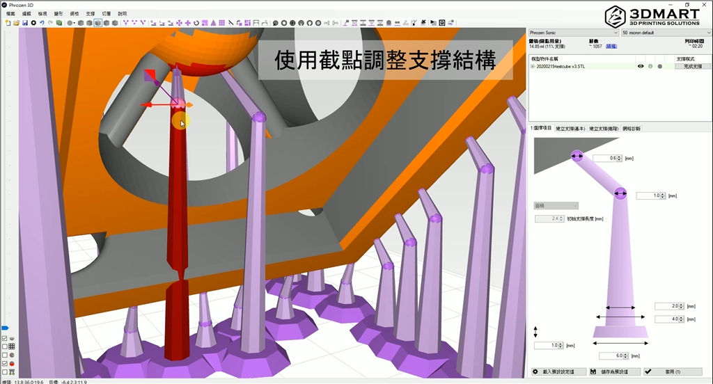 支撐結(jié)構(gòu)如果和3D模型重疊,軟體會(huì)自動(dòng)偵測(cè)並以「紅色」顯示錯(cuò)誤,在切片開(kāi)始前再三檢查並使用截點(diǎn)調(diào)整,可以有效節(jié)省樹(shù)脂的使用量、提高完整度。